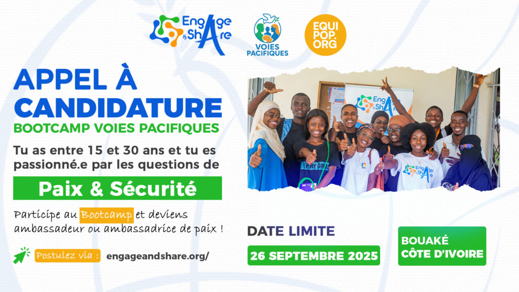 Nous sommes heureux d’annoncer le lancement officiel de notre projet « Voies Pacifiques », une initiative financée par Equipop dans le cadre de l’Agenda Femme, Paix et Sécurité. Ce projet vise à renforcer la participation des femmes et des jeunes dans la promotion de la paix, de la sécurité et de l’égalité de genre. Au programme : […]